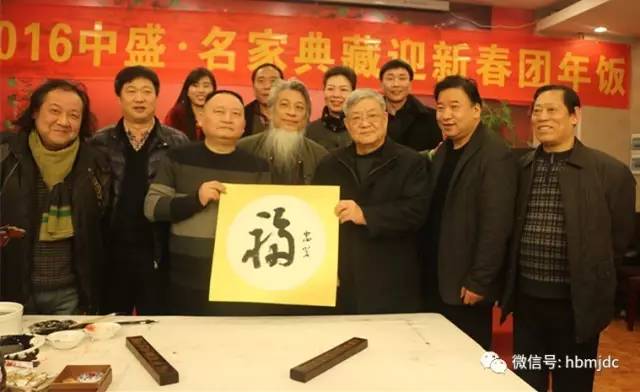 ▲ 2016年湖北中盛·名家典藏迎新春團(tuán)拜會(huì)上,原湖北省副省長、湖北省書法院院長著名書法家韓忠學(xué)贈(zèng)送墨寶祝賀。名家典藏出品人郭建、湖北省會(huì)展經(jīng)濟(jì)促進(jìn)會(huì)會(huì)長羅毅、湖北省汽車流通協(xié)會(huì)會(huì)長徐動(dòng)輝及著名畫家丁竹君、李小白等合影