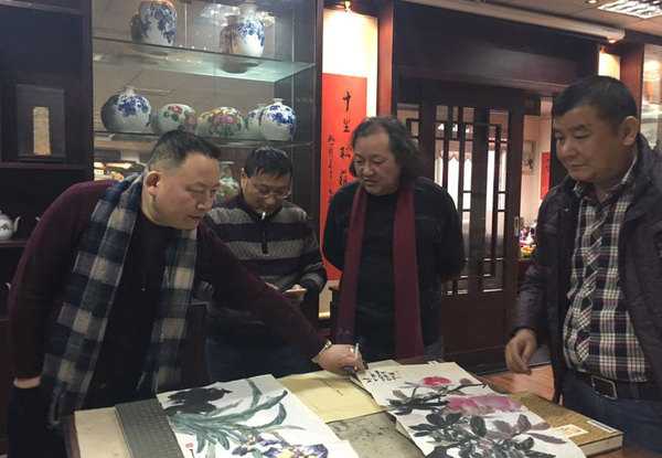 2017元旦第一天,名家典藏畫展嘉賓云集。湖北中國畫研究院副院長尹世順、荊州美協(xié)副主席李小白、湖北佛教書畫院院長朱聚一、肖像畫家向斌及企業(yè)家徐紅斌、劉曉軍、劉力源,名家典藏藝術(shù)機(jī)構(gòu)出品人郭建等合影留念。